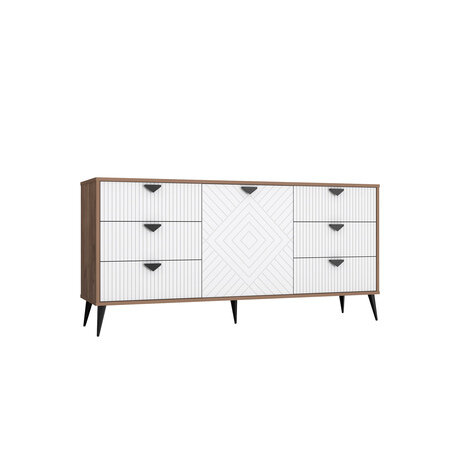 Ищете универсальное решение для хранения вещей, которое станет стильной деталью интерьера? Комод «Астрид АР-03» сочетает 6 вместительных ящиков и отделение за дверцей в компактном корпусе шириной всего 160 см. Контрастное сочетание табачного дуба с белыми фасадами и геометрический узор делают его заметным акцентом в любом пространстве. Три главных преимущества: - Продуманная эргономика — телескопические направляющие с доводчиками обеспечивают бесшумное закрывание ящиков - Современный дизайн — геометрический узор на центральной дверце и вертикальные линии на фасадах создают стильный образ - Качественные материалы — комбинация ЛДСП и МДФ гарантирует долговечность при ежедневном использовании Комод идеально подойдет для помещений от 12 кв.м. Его глубина позволяет разместить его даже в небольшой спальне или прихожей, не занимая много пространства. Благодаря высоким металлическим ножкам (14 см) под комодом легко проводить уборку, а столешница шириной 160 см становится функциональной поверхностью для декора или повседневных предметов.Технические особенности: